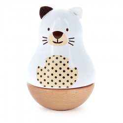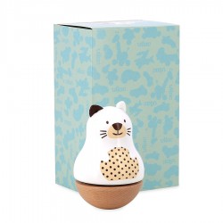 Cette boîte à musique en bois de hêtre massif laqué, nommée Mariette la minette, fait partie d'une collection d'animaux conçus et fabriqués à l'atelier Vilac en France.