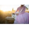 Les manches longues élégantes se terminent en pointe. La jupe présente une belle réunion abondante de tulle rose, finie avec une bordure réalisée avec le même imprimé holographique que le capulet. Le dos de la robe se ferme avec du Velcro, et la taille élastiquée avec une ceinture smockée (rassemblement de tissu supplémentaire) offre encore plus de confort et de flexibilité de taille.