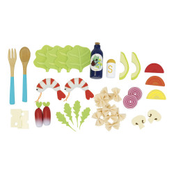 Ce grand kit de préparation de salade contient 40 pièces en bois et feutrine : un grand bol en fibre de bambou, 2 couverts à salade, une bouteille de vinaigrette, une salière, 2 tranches de champignons, 2 tranches d'avocat, 4 tranches de tomate, 2 radis, 2 oignons, 11 farfalles, 2 crevettes, 4 feuilles de roquette, 4 feuilles de chêne et 2 tranches de fromage.