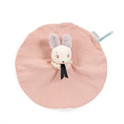 Découvrez le doudou de la souris Brume avec sa robe en lange rose poudré, surmontée d'une collerette à fleurs.