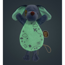 Autre surprise : Jules est phosphorescent. Quand la lumière s’éteint, ses oreilles et son ventre brodés s’illuminent doucement pour rassurer bébé dans la nuit. Une lueur douce et apaisante qui aide à s’endormir sereinement, tout en permettant de toujours retrouver son doudou dans le noir.