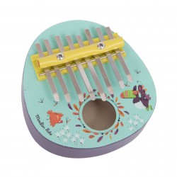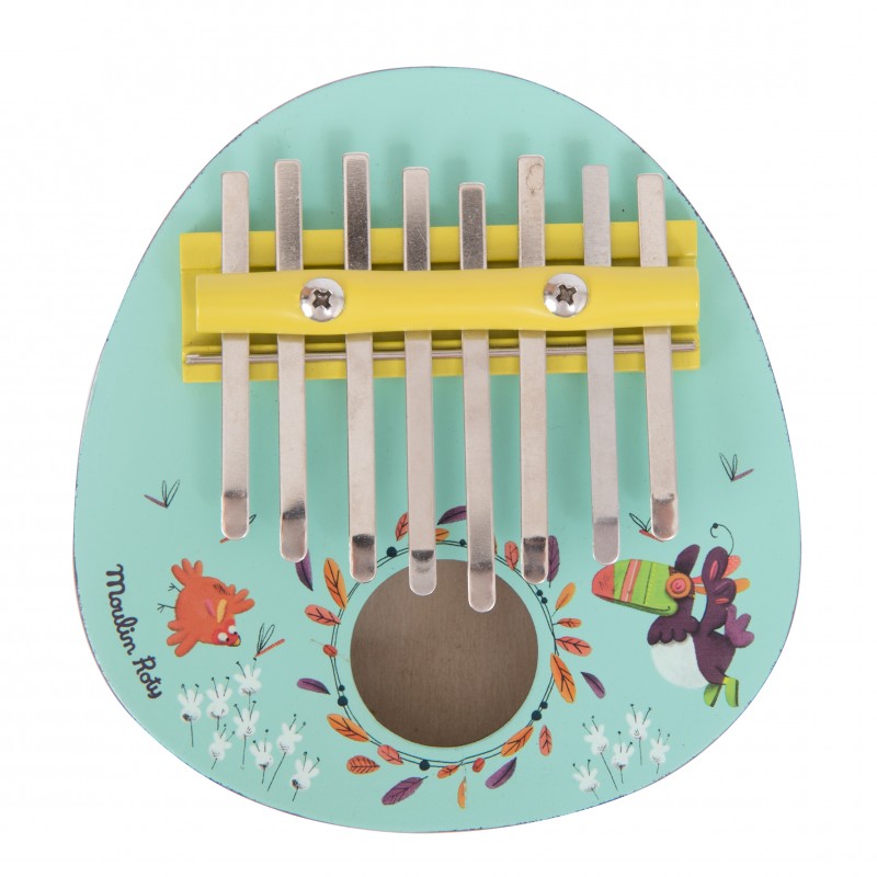 Kalimba en bois peint et lamelles métalliques, aux illustrations colorées et dansantes de Pakou le toucan de la collection Dans la jungle de Moulin Roty au milieu de plumes et fleurs de la jungle.