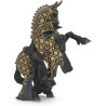 Le Cheval du Maître des Armes Cimier Taureau de Papo est une figurine représentant un destrier de guerre majestueux, prêt à accompagner son cavalier dans les batailles épiques du Moyen Âge. Revêtu d'une armure noire et dorée ornée de motifs de taureaux, symbole de force et de bravoure, ce cheval incarne la puissance et la noblesse des montures chevaleresques.