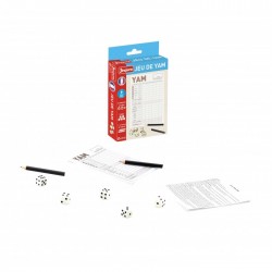 Le jeu de Yam de Jeujura combine chance et stratégie raisonnée. L'objectif est de créer des combinaisons avec les 5 dés pour accumuler un maximum de points. Le jeu comprend 5 dés de 16 mm, 1 bloc de Yam, 2 crayons de papier et la règle du jeu.