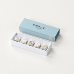 Présentés dans un écrin raffiné Bleu Dauphin, signature de la maison Grimaud, ces dés d'exception sont fabriqués en résine blanche de haute qualité.