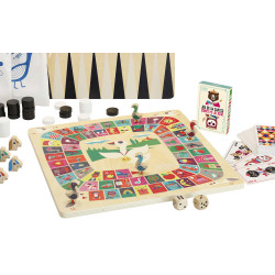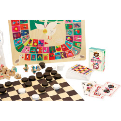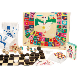 Ce coffret en bois permet de jouer à des classiques intemporels : dames, backgammon, petits chevaux, jeu de l’oie, ou simplement de profiter du jeu de 54 cartes illustré avec talent par Ingela P. Arrhenius. Parfait pour des moments de partage et de convivialité entre petits et grands !