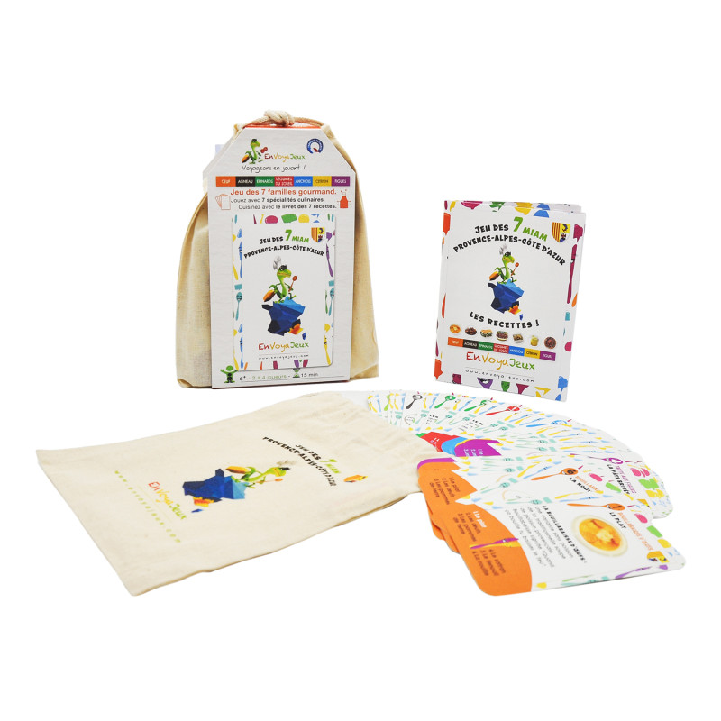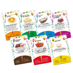 Ce jeu, conçu pour tous de 6 à 106 ans, se présente dans un joli pochon en coton imprimé. Il comprend 42 cartes et 2 cartes "règle du jeu", avec des coins arrondis pour une prise en main facile. Chaque famille représente un plat emblématique de la région, composée d’une carte "plat" et de 5 cartes "ingrédient".
