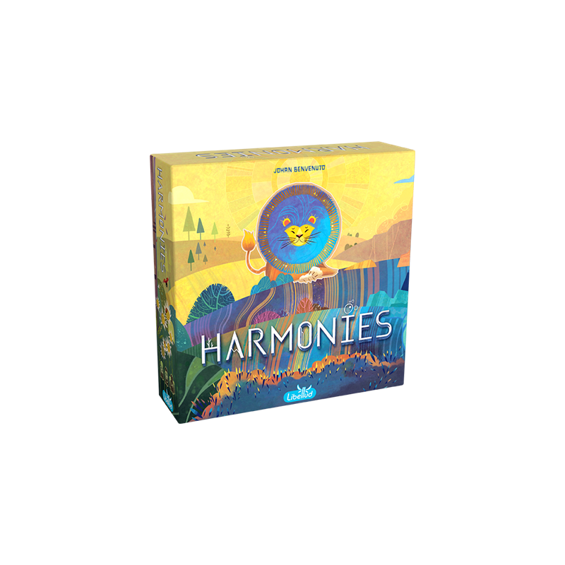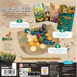 Dans ce captivant jeu de société, Harmonies de Libellud, distribué par Asmodee, chaque joueur construit un paysage unique en posant des séries de trois pions pour faire apparaître forêts, montagnes, champs et villes.
