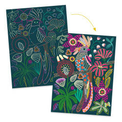 En suivant les instructions du livret, les enfants grattent la surface des cartes pour dévoiler progressivement des illustrations éclatantes aux couleurs fluo. Inspirées par un artiste, ces cartes permettent de faire apparaître des animaux tropicaux dans une ambiance chatoyante, comme par magie. Grâce à l'encre fluo, le résultat est flamboyant et spectaculaire !