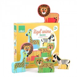 Découvrez le jeu d’éveil en bois Rigol'animo savane dessiné avec malice par Ingela P. Arrhenius.