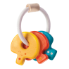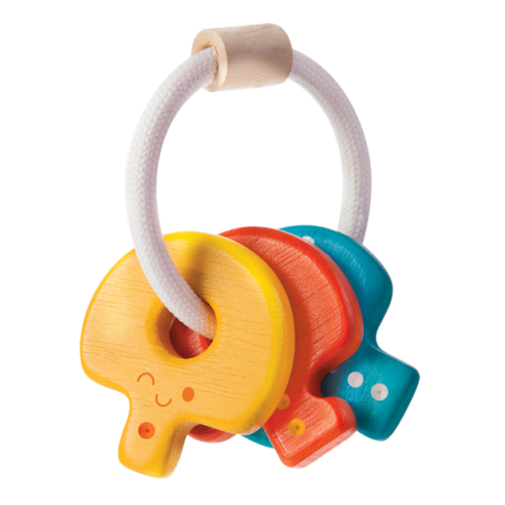 Ce hochet en corde comporte trois clés en bois, une rouge, une jaune et une bleue. Ce jouet de Plan Toys développe la motricité fine du bébé lorsqu'il le manipule.