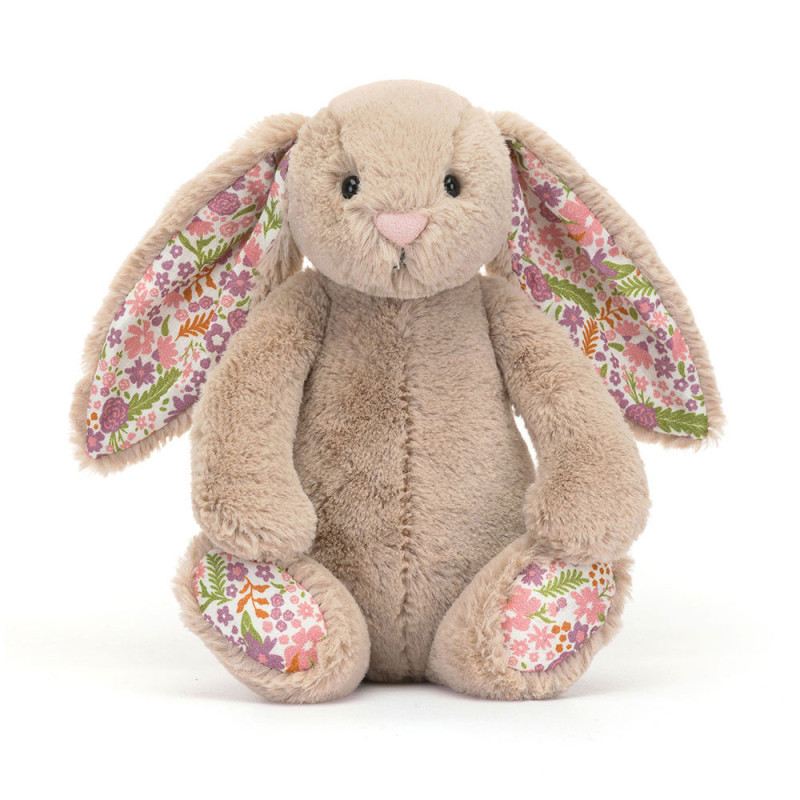 Cet adorable lapin a une fourrure des plus douces, des oreilles et des pattes fleuries à l'imprimé fantaisiste.
