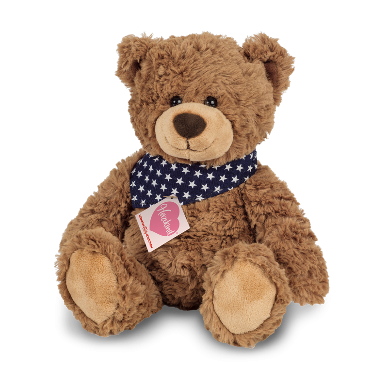 L’ours Teddy Rufus de Hermann Teddy est un véritable amoureux des câlins. Avec sa fourrure douce et son regard attendrissant, il est fait pour être serré dans les bras toute la journée. Son style unique le rend encore plus attachant : il porte un joli foulard à étoiles, qui lui donne une allure moderne et pleine de charme.