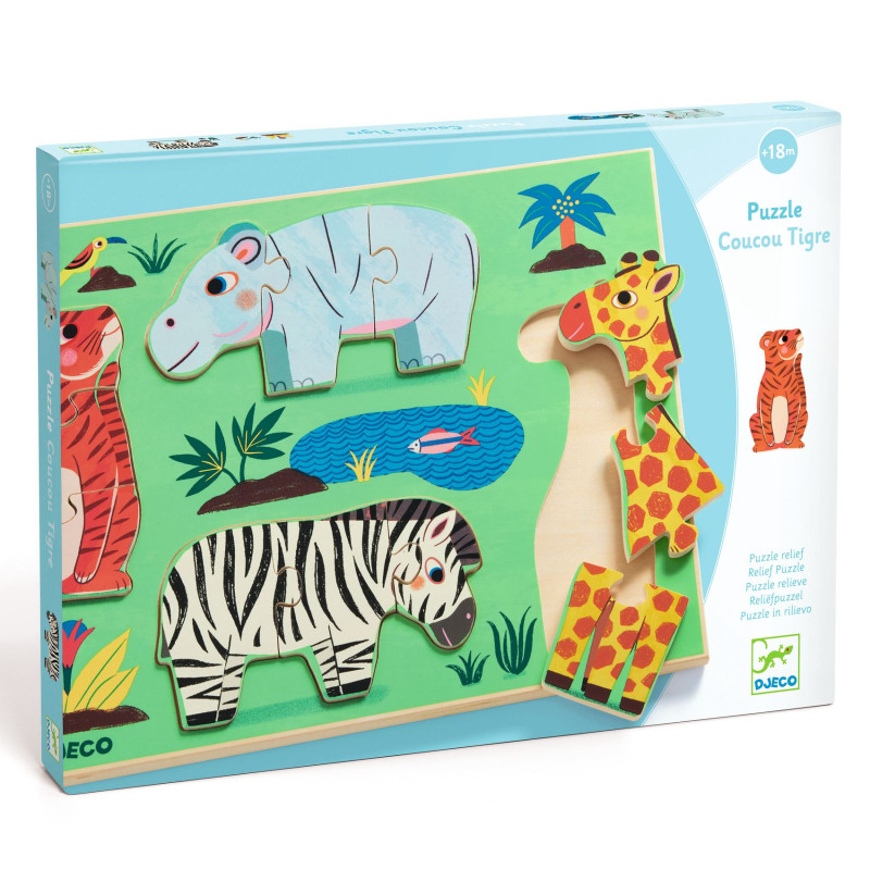 Le Puzzle Coucou Tigre de Djeco est un puzzle à encastrer en bois sur le thème des animaux de la savane, spécialement conçu pour les enfants dès 18 mois.