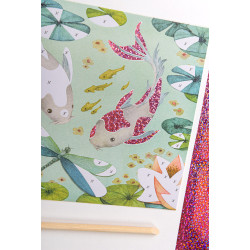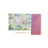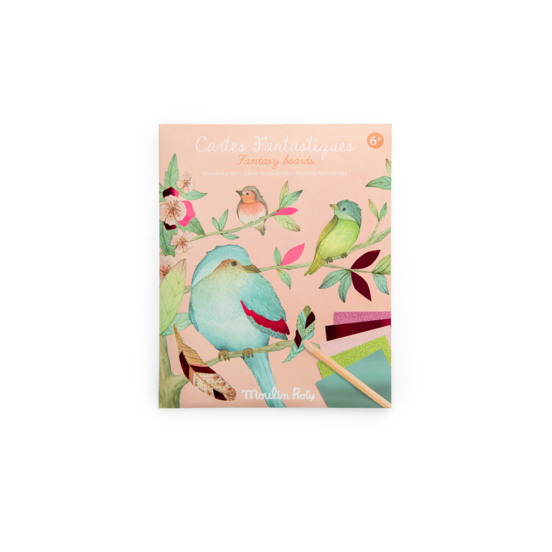 La pochette contient 6 cartes (oiseaux, papillons, renards, etc.), 10 feuilles fantastiques et 1 bâtonnet pour appliquer les décors.
