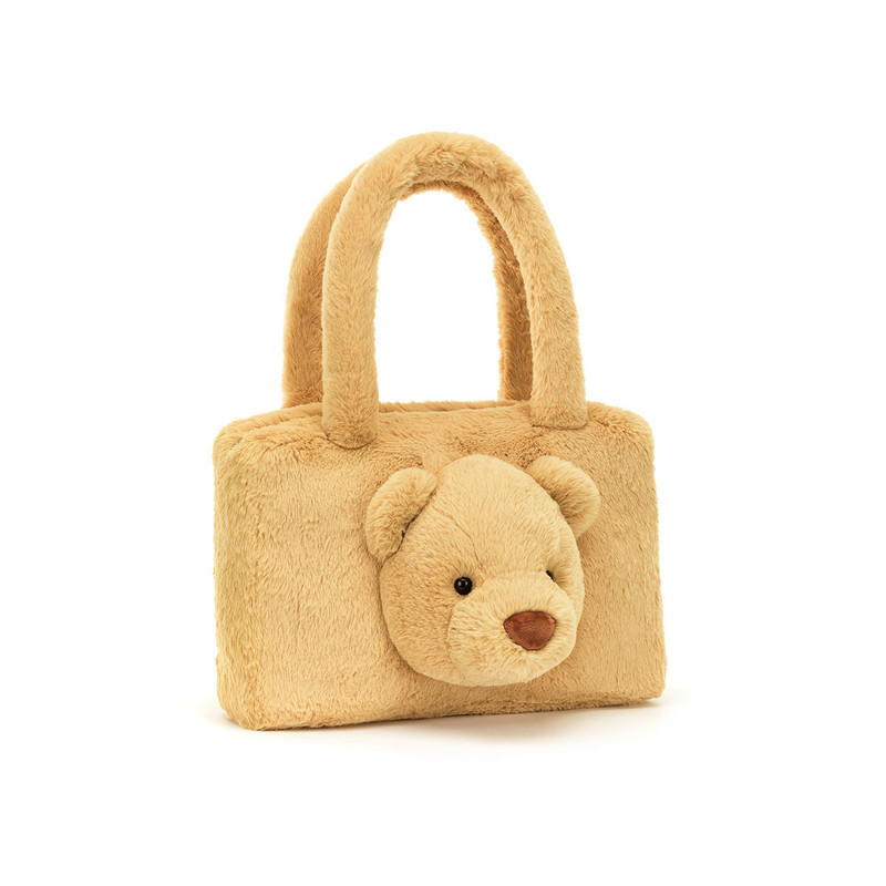 Ce sac unique et fantaisiste est recouvert de fourrure douce et doublé de coton, avec une fermeture éclair argentée et une étiquette Jellycat en métal. L’avant du sac est orné d’un grand visage d’ours adorable, accompagné de petites oreilles rondes et d’un nez en suédine caramel. Un accessoire tendance au charme kawaii irrésistible, parfait pour ajouter une touche de mignonnerie à votre quotidien.