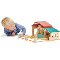 Fabriquée en contreplaqué de haute qualité, cette Ferme en bois de Tender Leaf a été conçue pour être ouverte et accessible aux petites mains. Elle comprend une grange avec des portes et une mangeoire, deux écuries avec des portes ouvrantes, une échelle menant au grenier à foin, un système de poulie avec une extrémité magnétique pour soulever les balles de foin, une étable avec des compartiments d'alimentation, quatre clôtures, un échalier, trois balles de foin, deux oies, deux chevaux, une mangeoire à grains, une mangeoire pour animaux, une ruche et 6 bûches.