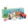 De jolis animaux en bois à empiler sur la remorque du tracteur.