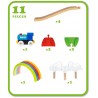 Ce coffret de 10 pièces, d'une dimension de 76 x 76 cm, comprend 4 rails montants, 4 rampes de guidage, 1 locomotive manuelle et 1 arc-en-ciel lumineux et sonore.